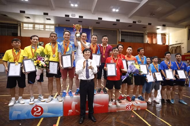 Ông Hồ Quang Lợi - Phó Chủ tịch Thường trực Hội Nhà báo Việt Nam, trao cúp vô địch đồng đội nam cho Liên chi hội nhà báo Bộ Công an
