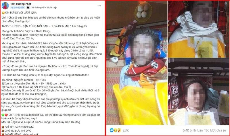 Những ngày qua, trên mạng xã hội Facebook, tài khoản có tên “Tâm Hướng Phật” đăng tải nội dung kêu gọi từ thiện về vụ việc 10 người lật thuyền, trong đó có 6 người bị tử vong ở khu vực xã Đại Cường và Đại Nghĩa (thuộc huyện Đại Lộc, tỉnh Quảng Nam).