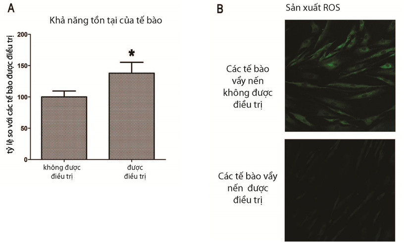 Ảnh 2. A): Thí nghiệm khả năng sống của tế bào nguyên bào sợi - B): Phân tích bằng kính hiển vi đồng tiêu sự sản xuất các chất chống oxy hóa nội bào của các nguyên bào sợi.