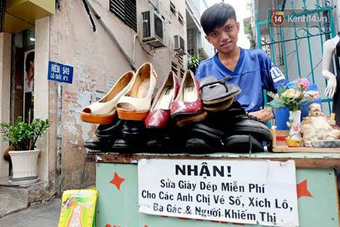 Hình ảnh chàng trai 19 tuổi nhỏ bé, gày gò sửa giày ở đầu con hẻm 549 đã quá quen thuộc với người dân trong khu vực, nhất là khi có tấm bảng sửa giày dép miễn phí cho tất cả mọi người, từ anh chị bán xổ số, đến những chú đạp xích lô, ba gác và đặc biệt là người khiếm thị. Nguyễn Bá Cường ngồi làm việc ở góc đường này đã lâu, và cũng chừng ấy thời gian tấm biển sửa giày dép miễn phí cho những người khó khăn được đóng lên. Chỗ Cường làm không có bảng hiệu, không có một cái tên nhưng hầu hết những người dân xung quanh đều biết.