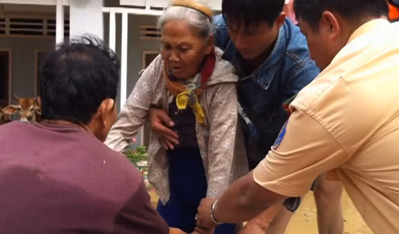 tiếp tục cứu nhiều người già ra khỏi vùng nước lũ.