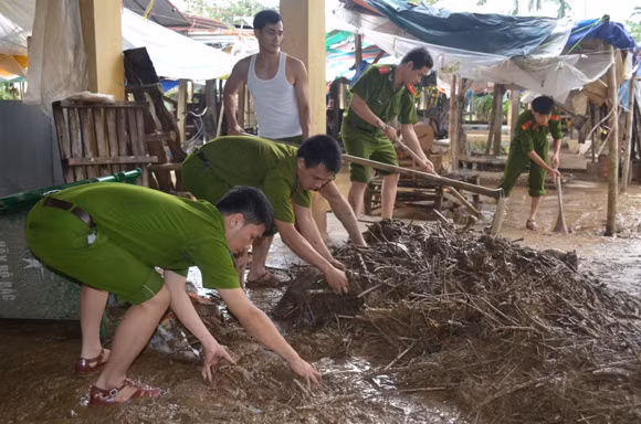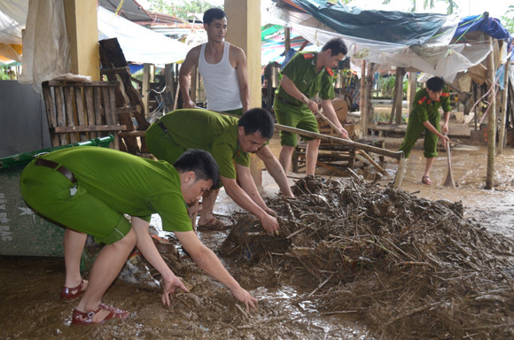 Sau lũ, cán bộ chiến sĩ Công an TP Quảng Ngãi tiếp tục giúp dân dọn vệ sinh,
