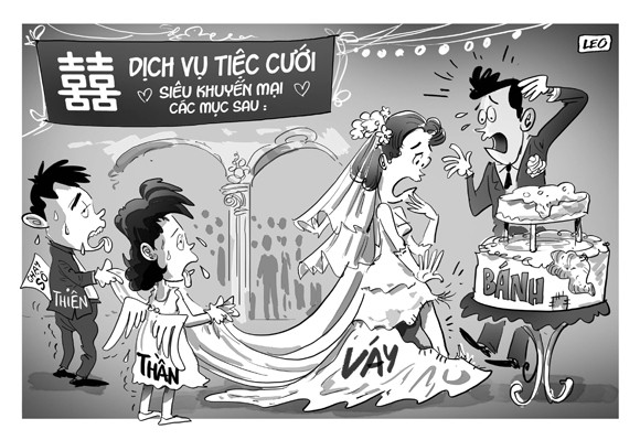 Cũng trong hoàn cảnh tương tự, do thấy chương trình khuyến mãi của một đơn vị tổ chức tiệc cưới khá hấp dẫn (miễn phí thiên thần, tặng bánh gato, giảm giá 30% tiền đặt cỗ nếu đặt từ 40 mâm trở lên) nên anh Lê Đình Hùng ở phường Xuân La, quận Tây Hồ đã quyết định đặt 42 mâm cỗ, nhiều hơn so với dự tính là 4 mâm. Anh Hùng đã rà soát danh sách, mời thêm khách để “phủ kín” 4 mâm này. Song đến ngày cưới, mọi chuyện diễn ra ngoàidự tính. 6 thiên thần mà đơn vị tổ chức tiệc cưới “khuyến mãi” tháp tùng cô dâu, chú rể trong tình trạng trang điểm lòe loẹt, ăn mặc cẩu thả, người thấp người cao, nét mặt buồn như đưa đám vì đã “chạy sô” quá nhiều. Bánh gato màu sắc sặc sỡ, gọi là tháp 5 tầng nhưng thực tế chỉ có một tầng bánh chưa cắt đã vỡ một góc. Trong khi đó, 4 mâm cỗ còn nguyên, không ai đụng đũa vì chất lượng quá… chán. Anh Hùng chia sẻ: “Chỉ vì hoa mắt trước khuyến mãi mà tôi phải chịu vì ế, bàn ra, tán vào, mất cả vui”.