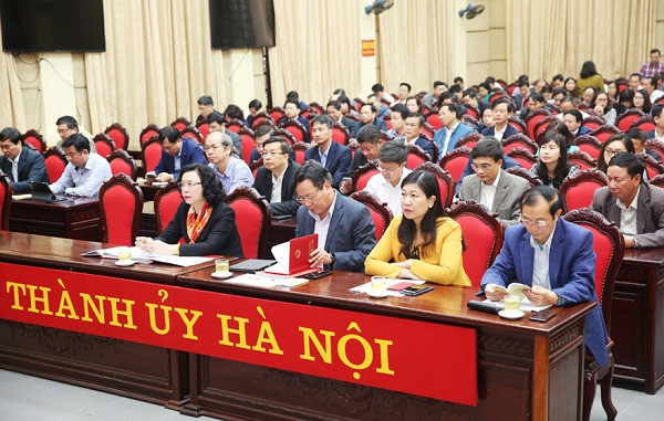 Các đại biểu dự hội nghị tại điểm cầu Thành ủy Hà Nội