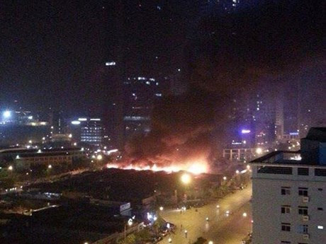 Đám cháy thứ hai bùng phát lúc 21 giờ 45 tại dãy ki-ốt đối diện trường tiểu học Nam Trung Yên, quận Cầu Giấy. Nơi đây được nhiều cửa hàng ăn uống, cũng như showroom ôtô thuê, bán hàng.
