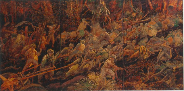 Những người lính băng rừng, lội suối, cần mẫn hành quân xuyên đêm (Hành quân qua suối của Tô Ngọc Vân, Hành quân đêm của Trần Đình Thọ), những chiến sĩ vượt đèo kéo pháo, đẩy pháo lên cứ điểm Điện Biên Phủ đầy nhọc nhằn, gian truân nhưng không kém phần lãng mạn (Kéo pháo Điện Biên của Trần Đình Thọ, Kéo pháo của Dương Hướng Minh).