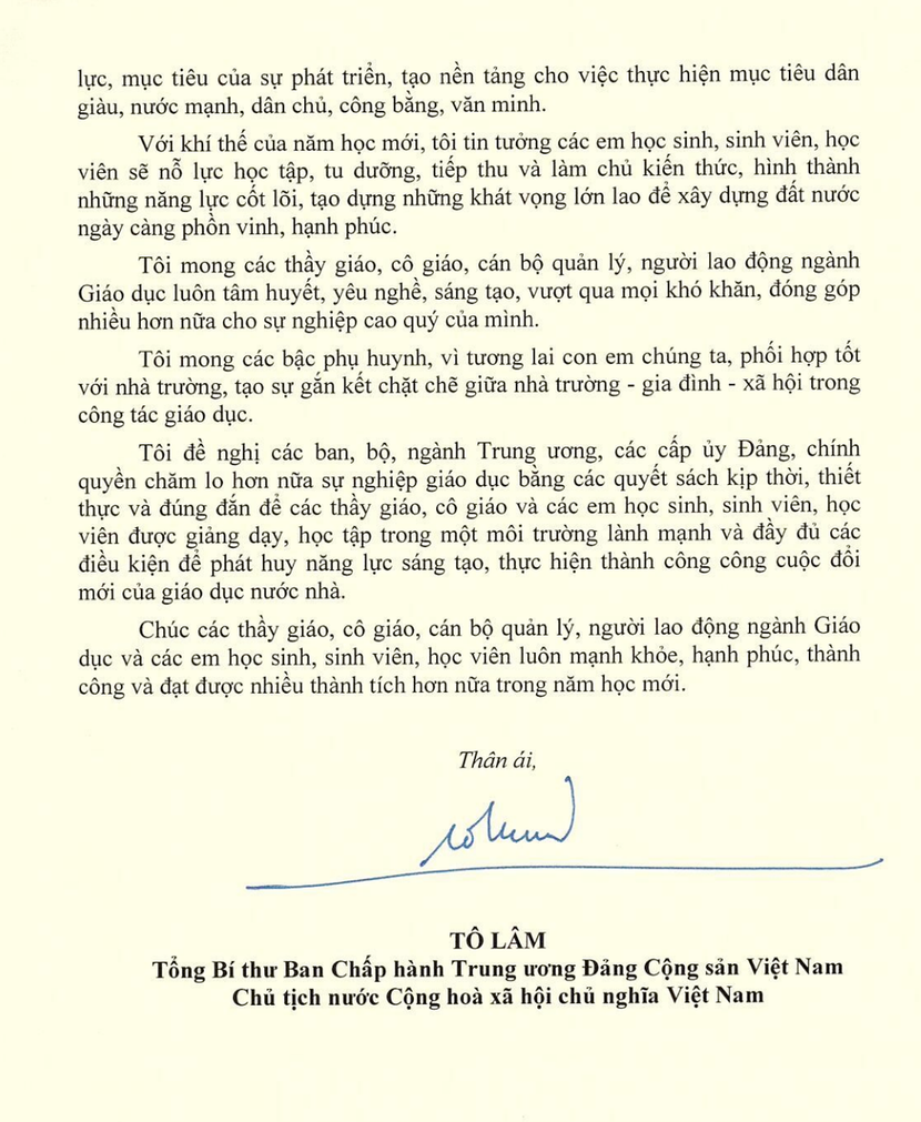 Trong ngày khai giảng năm học 2024-2025, Tổng Bí thư, Chủ tịch nước Tô Lâm đã gửi lời chúc tới đội ngũ cán bộ, giáo viên, học sinh sinh viên và học viên trong năm học mới: "Với khí thế của năm học mới, tôi tin tưởng các em học sinh, sinh viên, học viên sẽ nỗ lực học tập, tu dưỡng, tiếp thu và làm chủ kiến thức, hình thành những năng lực cốt lõi, tạo dựng những khát vọng lớn lao để xây dựng đất nước ngày càng phồn vinh, hạnh phúc.