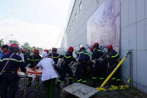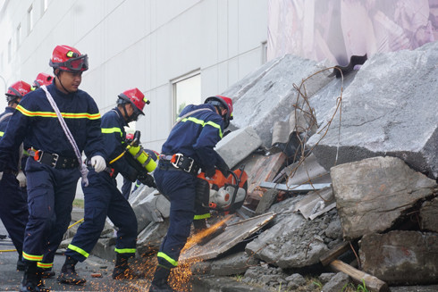 Lực lượng thực tập phối hợp cứu nạn, cứu thương trong tình trạng khẩn cấn