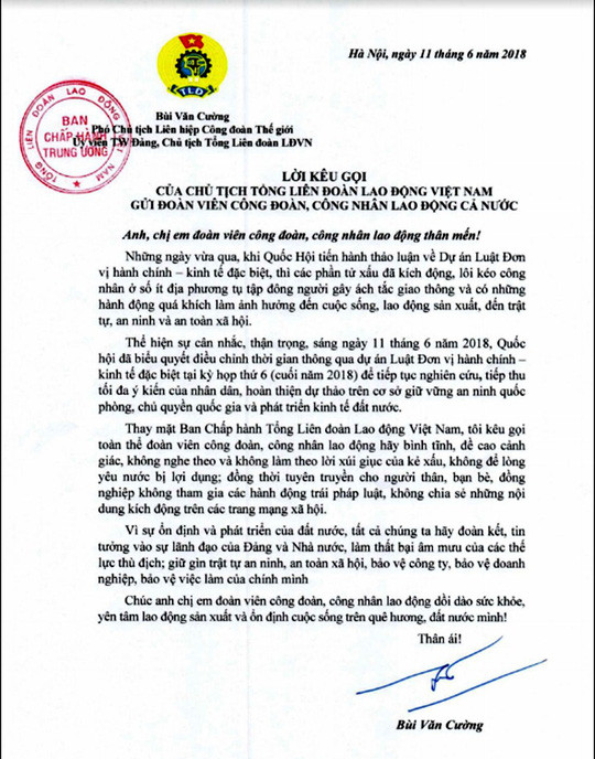 Ngày 11-6, Chủ tịch Tổng Liên đoàn Lao động Việt Nam Bùi Văn Cường đã có lời kêu gọi gửi đoàn viên Công đoàn, công nhân lao động cả nước.