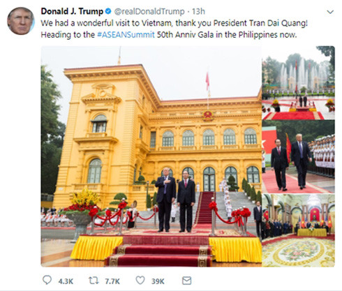 "Chúng tôi đã có một chuyến thăm Việt Nam tuyệt vời, cảm ơn Chủ tịch Trần Đại Quang!", Tổng thống Mỹ Trump ngày 12/11 viết trên Twitter. Ông Trump đăng ảnh chụp ông và Chủ tịch nước Trần Đại Quang trong lễ đón tại Phủ Chủ tịch.