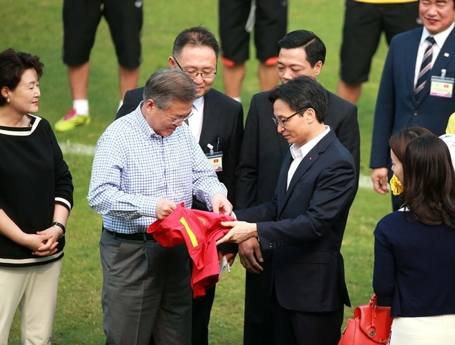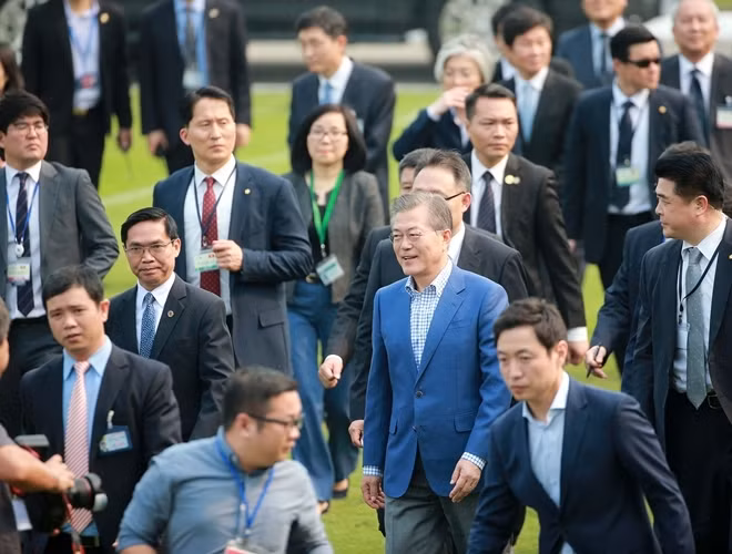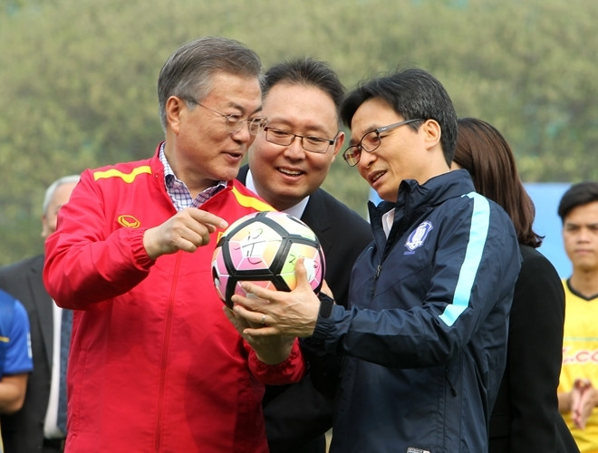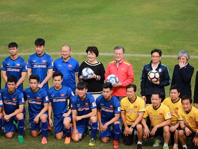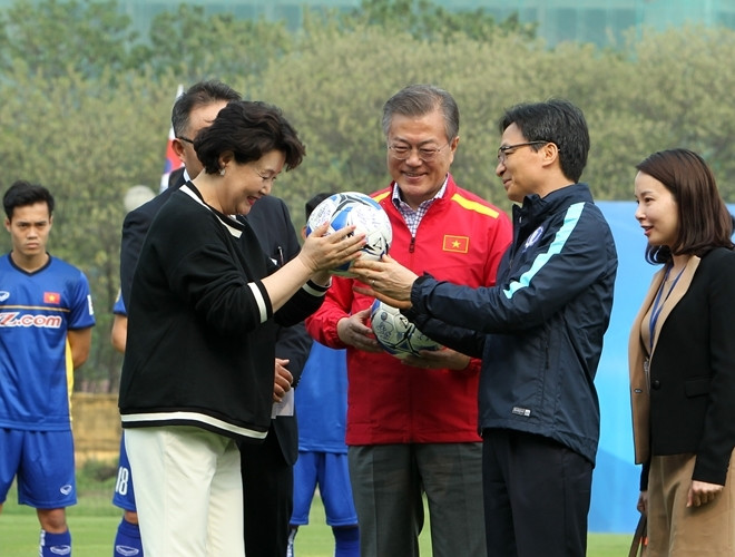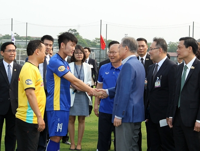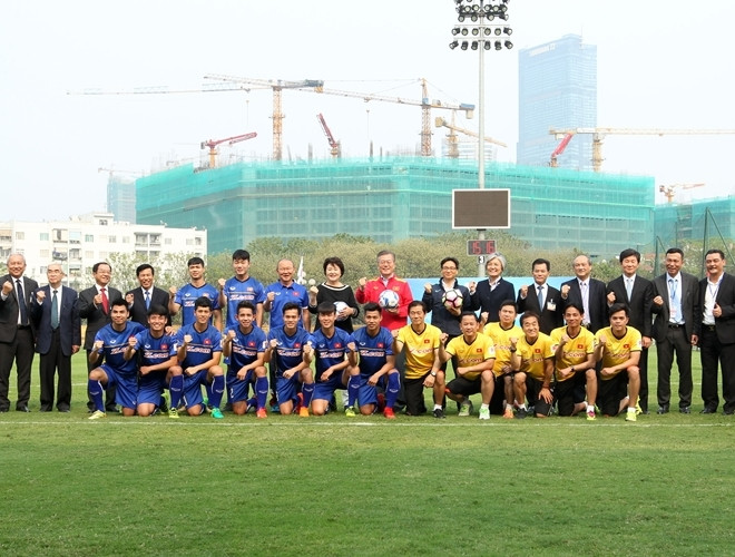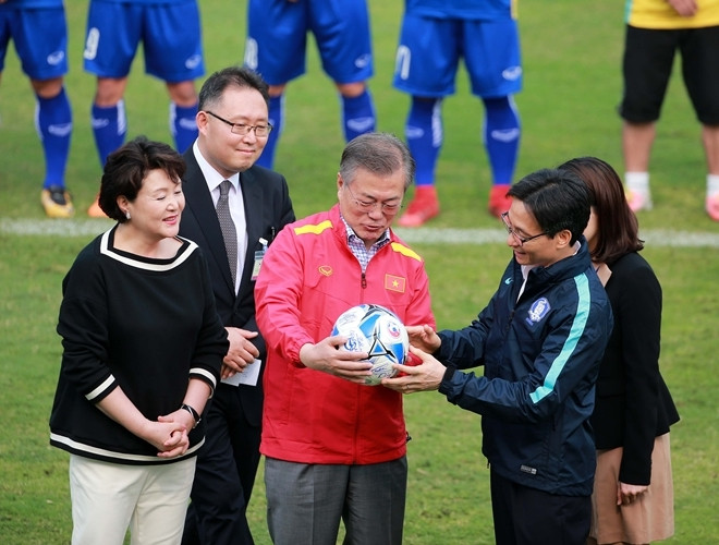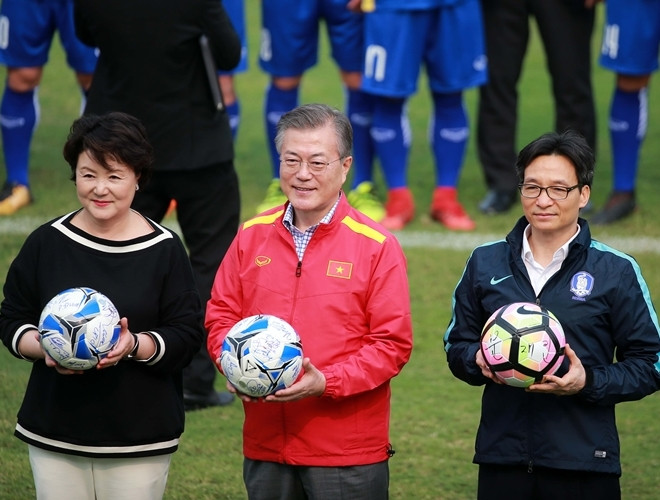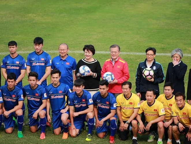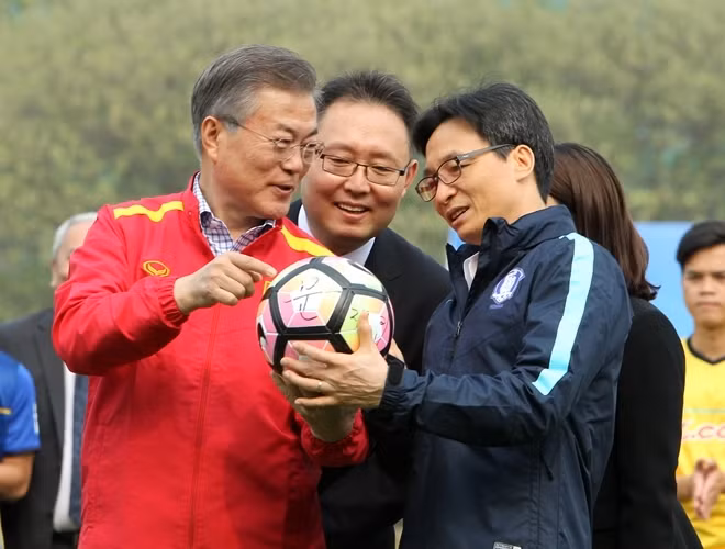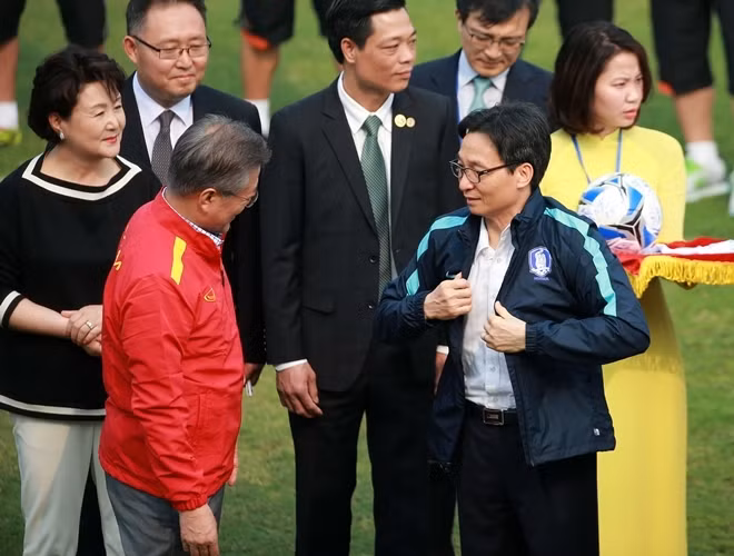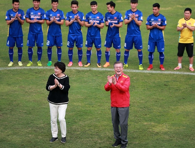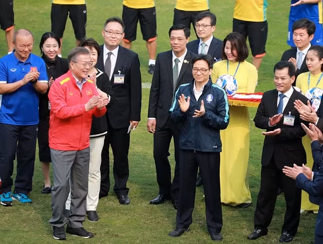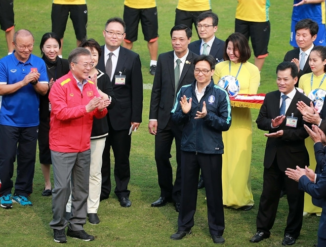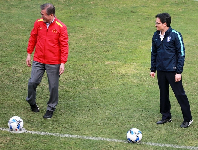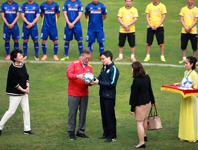 ANTD.VN - Tổng thống Hàn Quốc Moon Jae-in cùng Phó Thủ tướng Chính phủ Vũ Đức Đam khoác áo đội tuyển quốc gia mỗi nước, rất gần gũi và thân mật khi giao lưu cùng HLV Park Hang-seo và một số thành viên đội tuyển U23 Việt Nam vào chiều nay, 22-3.
