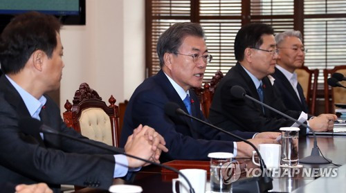 Tổng thống Moon Jae-in (thứ 2 từ trái) phát biểu trong một cuộc họp hàng tuần với các trợ lý tổng thống tại văn phòng Cheong Wa Dae ở Seoul vào ngày 22/1/2018