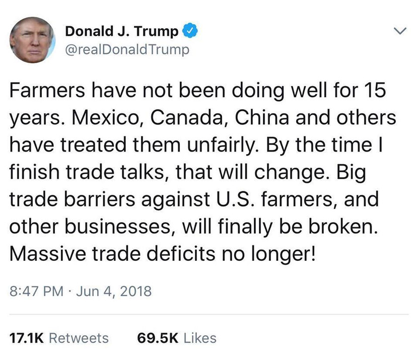 Ông viết: “Những người nông dân đã không làm tốt công việc của mình trong 15 năm qua. Mexico, Canada, Trung Quốc và những quốc gia khác đã đối xử với họ không công bằng. Vào thời điểm tôi kết thúc đàm phán thương mại, mọi thứ sẽ thay đổi”.