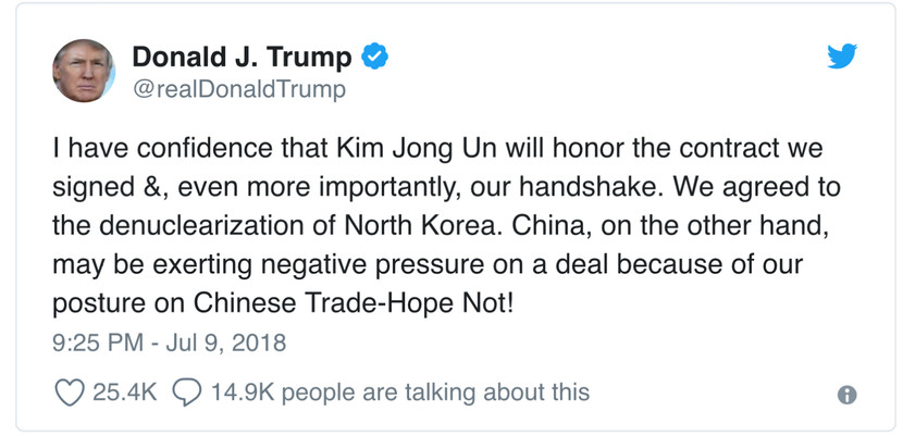 Viết trên mạng xã hội Twitter, Tổng thống Trump nêu rõ: "Tôi tin tưởng rằng ông Kim Jong-un sẽ tôn trọng thỏa thuận chúng tôi đã ký kết và, quan trọng hơn, tôn trọng cái bắt tay của chúng tôi. Chúng tôi đã nhất trí phi hạt nhân hóa Triều Tiên. Trong khi đó, Trung Quốc có khả năng sẽ gây sức ép tiêu cực tới thỏa thuận Mỹ-Triều do lập trường của chúng tôi đối với thương mại Trung Quốc. Tôi hy vọng là điều này sẽ không xảy ra".