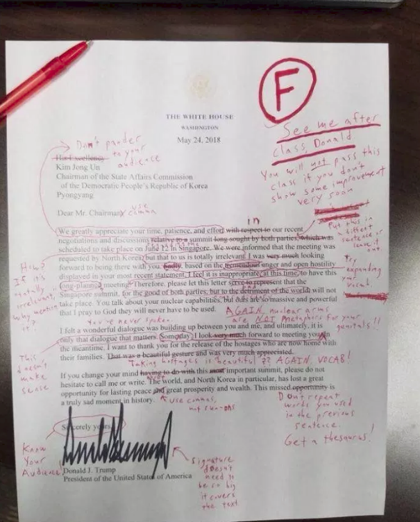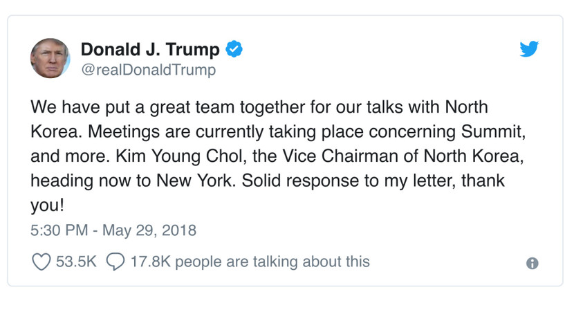 Ông viết: “Chúng tôi đã có một đội ngũ tuyệt vời đối thoại với Triều Tiên. Các cuộc họp hiện đang diễn ra liên quan đến Hội nghị thượng đỉnh và sẽ còn nhiều cuộc gặp hơn thế nữa. Ông Kim Young Chol, Phó Chủ tịch của Triều Tiên, đang hướng đến New York. Lời phúc đáp mạnh mẽ với lá thư của tôi, xin cảm ơn! ”