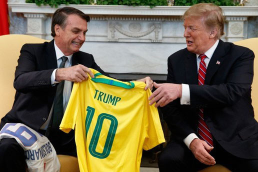 Tổng thống Trump ca ngợi nền bóng đá Brazil và tặng chiếc áo in tên Bolsonaro, trong khi Tổng thống Brazil cũng tặng người đồng cấp Mỹ món quà tương tự.
