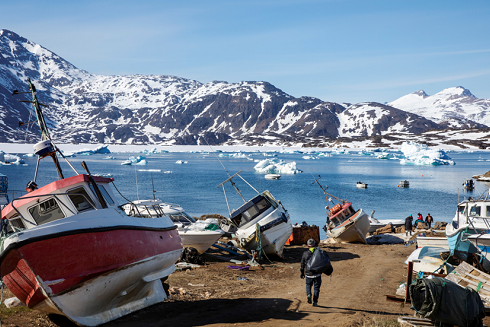 Một người đàn ông đi bộ qua những con thuyền bị bỏ rơi để đến con thuyền của mình đang cập cảng ở thị trấn Tasiilaq, Greenland (Ảnh: Reuters)