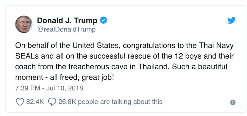 "Thay mặt nước Mỹ, xin chúc mừng đặc nhiệm SEALs Hải quân Thái Lan và tất cả vì đã giải cứu thành công 12 cậu bé và huấn luyện viên của họ từ nơi hang động nguy hiểm ở Thái Lan," tổng thống Trump viết trên tweet.