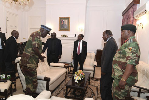 Linh mục Fidelis Mukonori (thứ hai từ trái sang) trong cuộc gặp bàn về việc từ chức của Tổng thống Mugabe với các tướng lĩnh