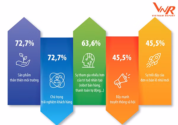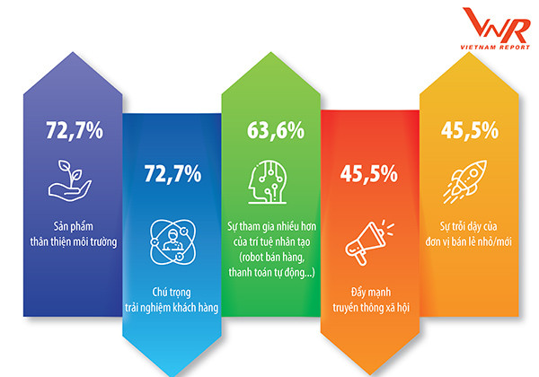 Trong câu hỏi về nhận định xu hướng chính của ngành Bán lẻ trong ít nhất 3 năm tới, kết quả khảo sát của Vietnam Report cũng cho thấy trong số top 3 xu hướng được đề cập nhiều nhất, các doanh nghiệp cũng nhắc đến sự tham gia nhiều hơn của Trí tuệ nhân tạo trong ngành (chiếm tỷ lệ phản hồi 63,64%).