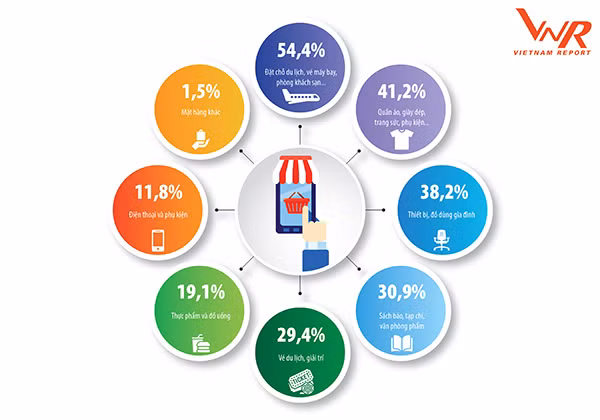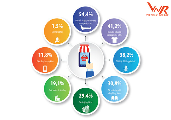 Theo khảo sát của Vietnam Report về hành vi người dùng, trong các nhóm mặt hàng mà người tiêu dùng thường sử dụng kênh trực tuyến để mua nhất thuộc về ba nhóm hàng chính là Đặt chỗ du lịch, vé máy bay, khách sạn (chiếm tỷ lệ 54,4%); Quần áo, giày dép (41,2%) và thiết bị đồ dùng gia đình (38,2%).