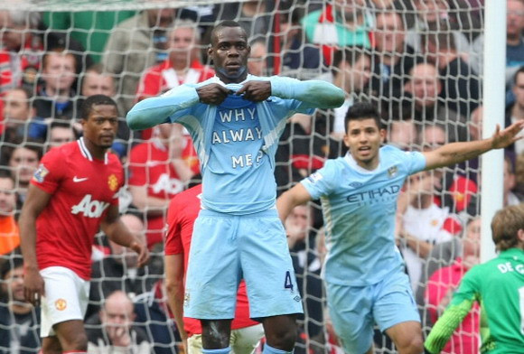 Balotelli chắc chắn không thể vắng mặt trong danh sách này. Anh luôn được nhớ đến với pha ăn mừng bàn thắng trong trận derby thành Manchester: Khoe chiếc áo có dòng chữ “Tại sao luôn là tôi?” (Why always me?)