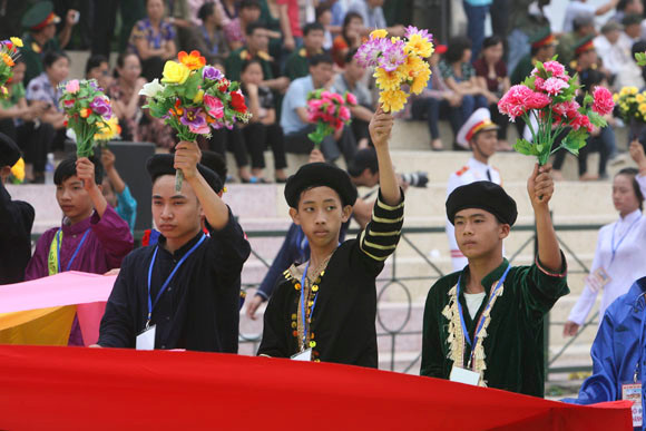 Đại diện bà con đồng bào Tây Bắc vẫy chào đoàn diễu binh