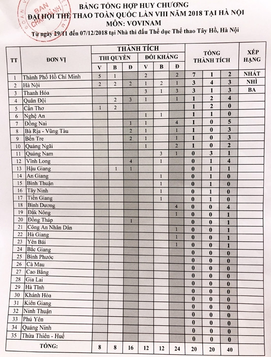 Kết thúc môn vovinam tĐại hội thể thao toàn quốc 2018, đoàn TP.HCM nhất toàn đoàn với 7 HCV, 1 HCB, 2 HCĐ. Chủ nhà Hà Nội xếp nhì với 3 HCV, 4 HCB, 3 HCĐ.