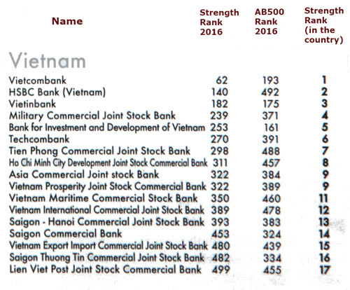 Tạp chí tài chính ngân hàng hàng đầu của khu vực Châu Á The Asian Banker (TAB) mới công bố bảng tổng kết, đánh giá và xếp loại các ngân hàng mạnh nhất của Châu Á Thái Bình dương năm 2016.
