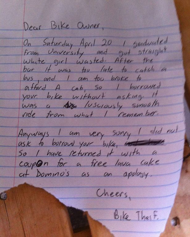Dù không xác định được danh tính tên trộm và nhận được một món quà không còn giá trị sử dụng, nhưng chủ nhân của chiếc xe đạp này cũng phải thừa nhận rằng mình không có lí do gì để tức giận tên trộm này.