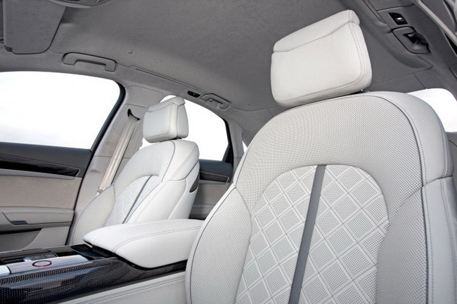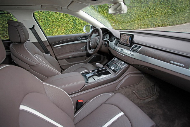 Bên cạnh đó, Cabin của S8 là sự kết giữa những vật liệu cao cấp truyền thống với những công nghệ hiện đại bậc nhất. Những chiếc ghế da được khâu hình kim cương và ghế trước có thể điều chỉnh 22 vị trí khác nhau cộng thêm chức năng massage. Quanh cabin xe là một gạch ngang chạy từ bảng tap-lô đến hết cửa sau, được ốp bằng gỗ hoặc sợi carbon. Không gian nội thất chiếc S8 được thử có màu trắng-xám, và màu nâu, những màu sắc không tương phản mạnh nhưng lại tạo cái nhìn rất sang trọng.
