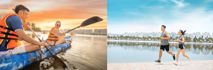 Những ai yêu thích hoạt động cũng có thể tham gia nhiều bộ môn thể thao như chạy bộ, tập thể hình tại công viên nội khu hoặc công viên gym; đạp xe, bóng đá, tennis, cầu lông hay chèo thuyền kayak trên hồ Ngọc Trai rộng 24,5 ha...