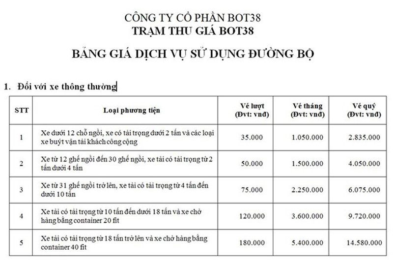 Theo quyết định, Bộ GTVT chấp thuận cho Công ty CP BOT 38 (doanh nghiệp dự án) tổ chức thu phí sử dụng đường bộ tại trạm Km11+625 trên QL38 kể từ 0h ngày 10-4-2018 để hoàn vốn đầu tư cho dự án đầu tư cải tạo nâng cấp QL38 đoạn nối QL1 với QL5 qua địa phận tỉnh Bắc Ninh và Hải Dương theo hình thức BOT.