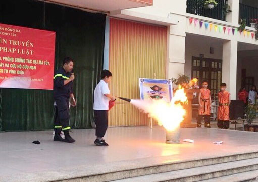 Các CBCS hướng dẫn học sinh trường THCS Tô Vĩnh Diện sử dụng bình chữa cháy