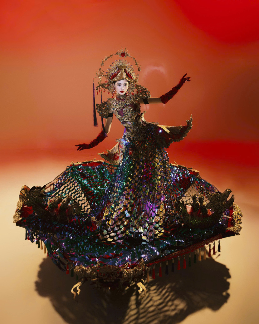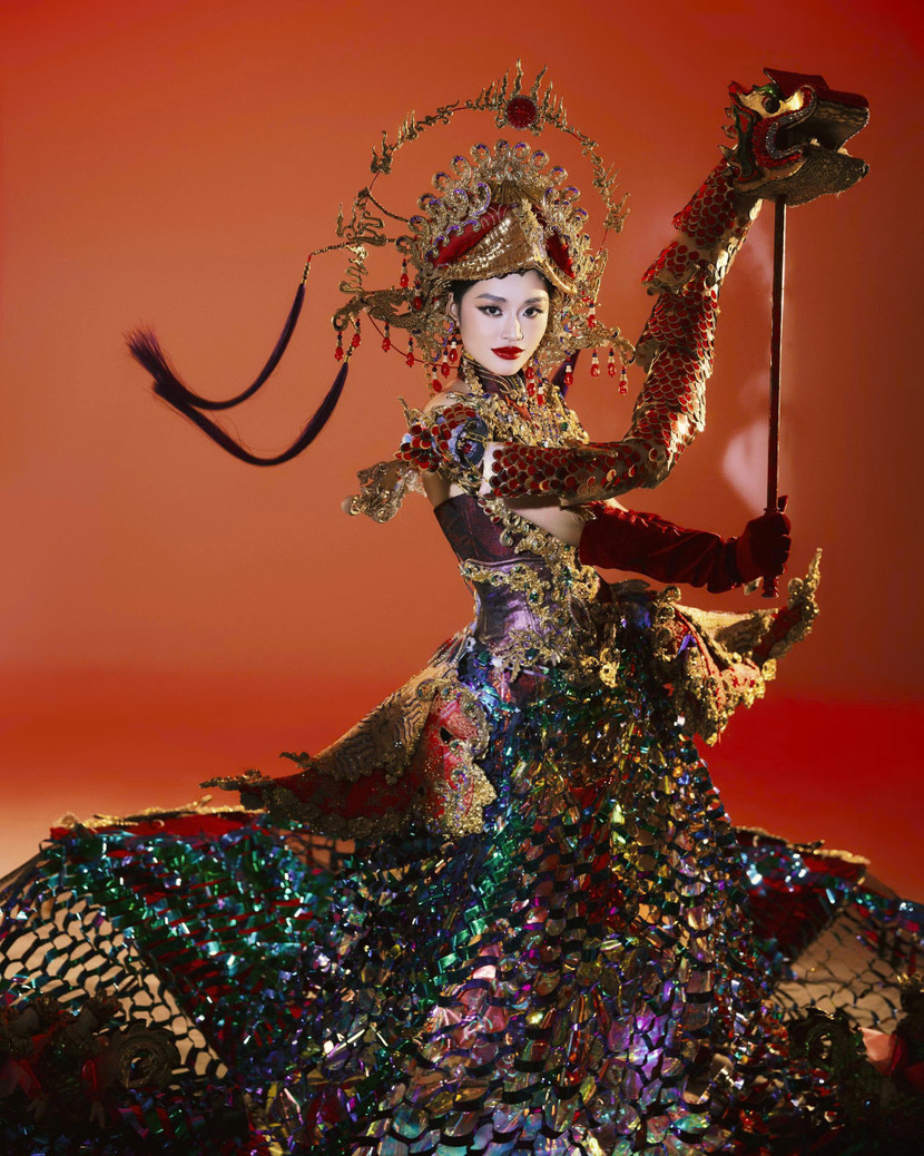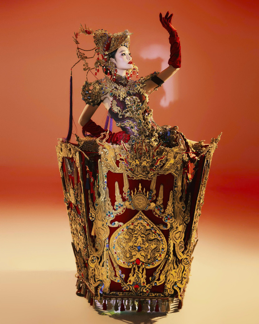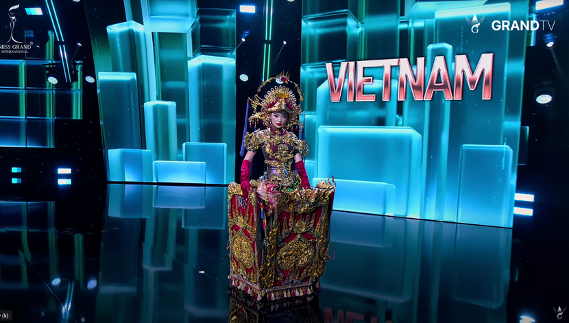 Bộ trang phục dân tộc “Thăng Long Hội” có trọng lượng khoảng 30kg với kích thước lớn và kết cấu cồng kềnh, đòi hỏi kỹ năng trình diễn vững vàng cùng khả năng làm chủ sân khấu. Trước khán giả quốc tế, đại diện Việt Nam sải bước tự tin, bản lĩnh, thể hiện sự chuẩn bị kỹ lưỡng và tinh thần chuyên nghiệp.