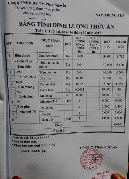 Đối chiếu với thực đơn nhà trường đưa ra ngày 16-10 thì học sinh được ăn tôm chiên giòn, thịt sốt chua ngọt, rau muống xào, canh chua me. Tuy nhiên khi so sánh hình ảnh suất cơm của học sinh thì chỉ thấy bát ăn của học sinh gồm cơm, rau muống và ít thịt băm.