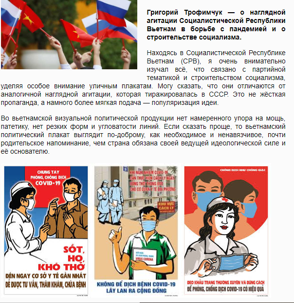 Ông Grigory Trofimchuk trả lời tờ Rusvesna ngày 22/6, ông có nhiều năm gắn bó với Việt Nam. Trong thời gian dịch bệnh bùng phát trên khắp thế giới và nhìn lại những gì Việt Nam hành động, một điều khiến ông chú ý đó là những bức tranh cổ động.