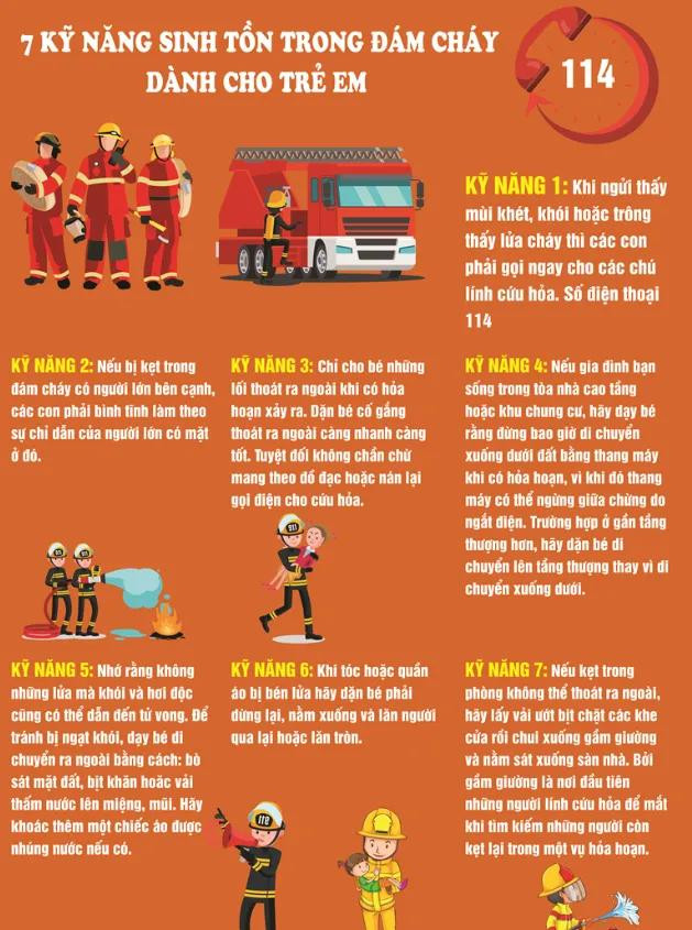 Kỹ năng 1: Khi ngửi thấy mùi khét, khói hoặc trông thấy lửa cháy phải chạy ngay ra vùng khói khí, hô hoán báo cho người lớn và gọi ngay cho lính cứu hoả qua số điện thoại 114.