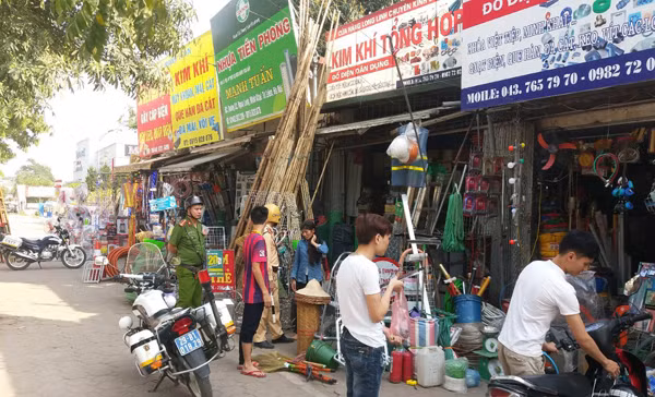 Lực lượng Công an nhắc nhở các hộ kinh doanh sắp xếp hàng quán đảm bảo TTĐT