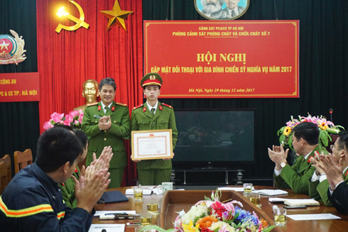 Đại diện chỉ huy phòng Cảnh sát PCCC số 7 trao khen thưởng cho chiến sỹ có thành tích