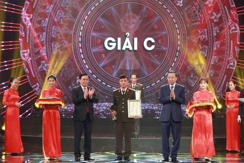 Đại tướng Tô Lâm, Ủy viên Bộ Chính trị, Bộ trưởng Bộ Công an và Ủy viên Bộ Chính trị, Phó Thủ tướng Vương Đình Huệ trao Giải C cho đại diện nhóm tác giả Báo An Ninh Thủ đô