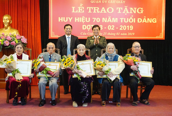 Thiếu tướng Đoàn Duy Khương, cùng đại diện lãnh đạo quận Cầu Giấy chúc mừng các Đảng viên được trao tặng Huy hiệu 70 năm tuổi Đảng