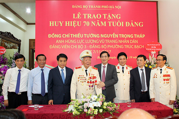 Phát biểu tại buổi lễ, Chủ tịch UBND TP bày tỏ sự vui mừng và vinh dự khi được trao tặng Huy hiệu 70 năm tuổi Đảng cho đồng chí Nguyễn Trong Tháp. Chủ tịch UBND TP chúc mừng và khẳng định đây là niềm vinh dự của đồng chí Nguyễn Trọng Tháp, niềm tự hào của toàn thể gia đình, đồng thời cũng là niềm vui chung của Chi bộ 3 nơi đồng chí đang sinh hoạt, của Đảng bộ phường Trúc Bạch cũng như của Đảng bộ quận Ba Đình và Đảng bộ thành phố Hà Nội.