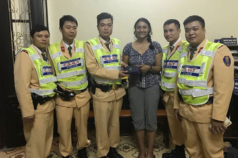 Các CBCS Đội CSGT số 3 trao trả tài sản cho vị khách người nước ngoài.