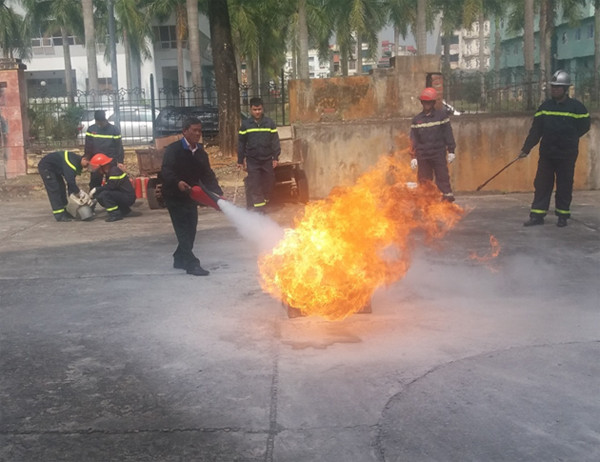 Các học viên sử dụng bình chữa cháy dập tắt khay xăng đang cháy