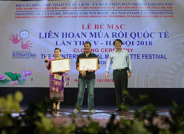 Ban tổ chức trao HCV ở hạng mục chương trình biểu diễn xuất sắc nhất cho vở rối nước “Trê - Cóc” của Nhà hát Múa rối Việt Nam và tiết mục “Âm thanh của nhà tôi” của Đoàn múa rối quốc gia Lào. Ảnh: Thanh Tùng/TTXVN