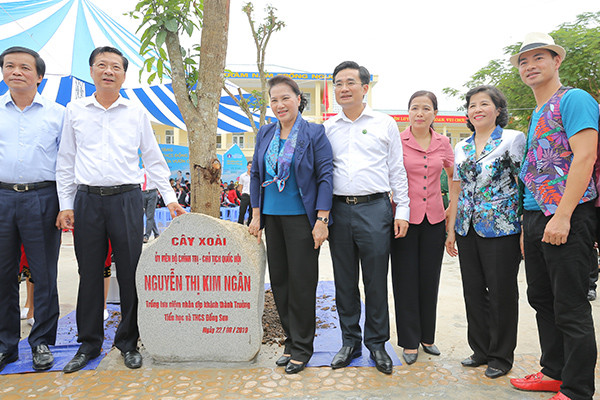 Bà Nguyễn Thị Kim Ngân - Uỷ viên Bộ chính trị, Chủ tịch Quốc hội nước Cộng hoà XHCN Việt Nam và các đại biểu trồng cây lưu niệm cho ngôi trường mới.