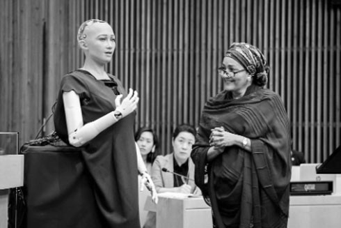 Robot có trí tuệ nhân tạo Sophia đang tương tác với Phó Tổng Thư ký Liên hợp quốc Amina J. Mohammed