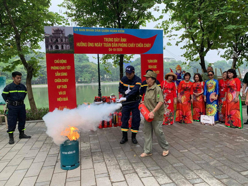 Lực lượng PCCC quận Hoàn Kiếm hướng dẫn người dân cách sử dụng bình cứu hỏa tại triển lãm ảnh.