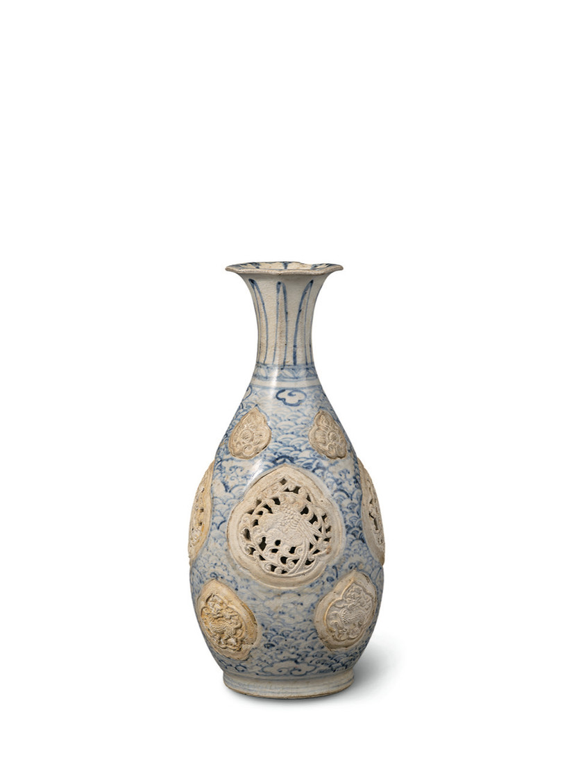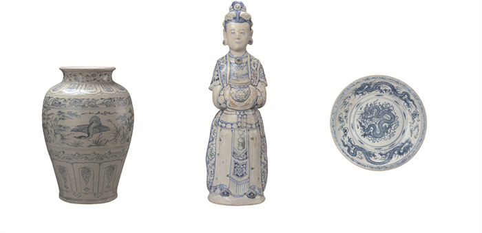Bình hoa lam vẽ thiên nga (Bảo vật quốc gia); Tượng nữ quý tộc; Đĩa men trắng, vẽ lam (Gốm, thế kỷ XV), khai quật Tàu đắm cổ Cù Lao Chàm, Hội An, Quảng Nam 1997- 2000